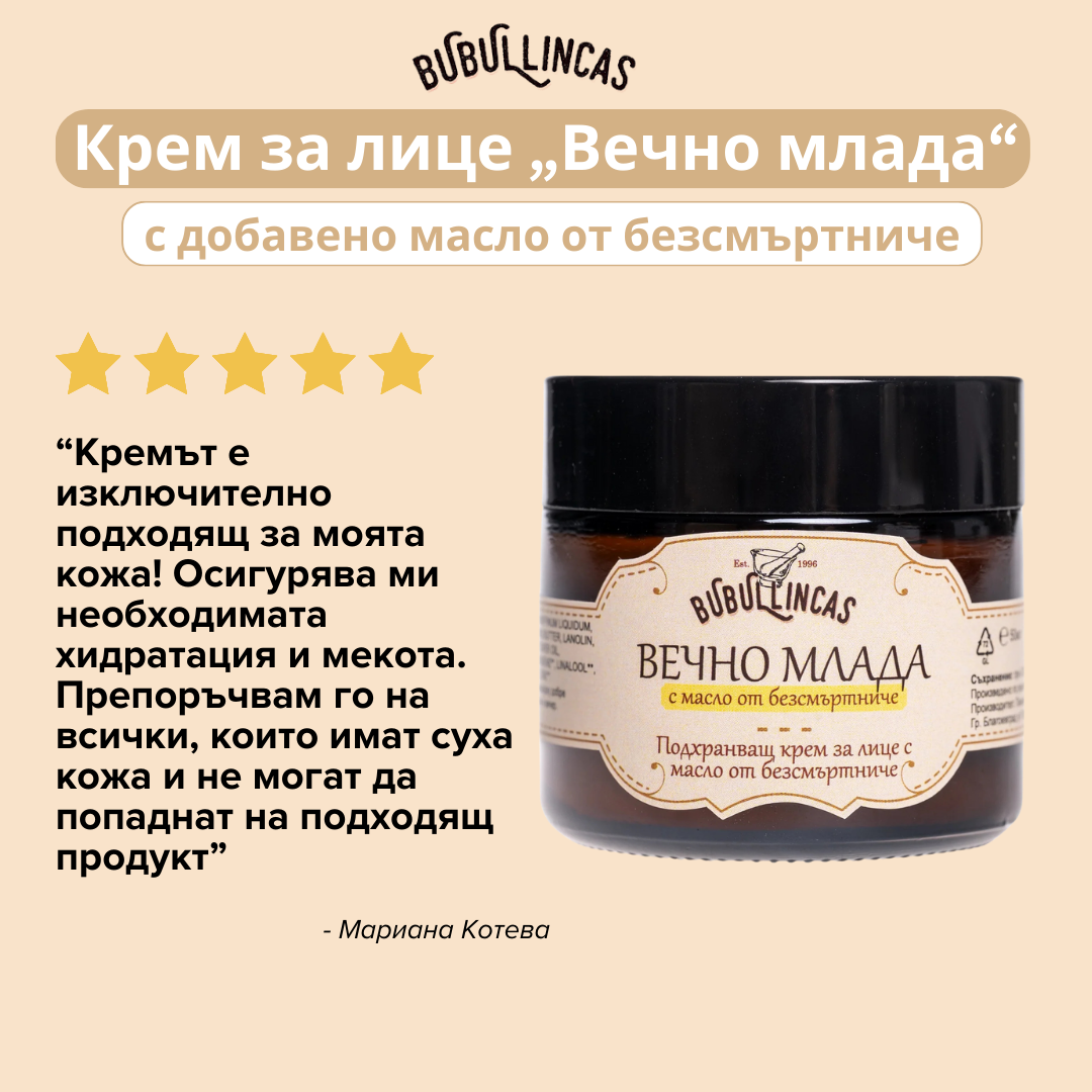 Да, формулата на „Вечно Млада“ е специално създадена за чувствителна кожа. Без добавени консерванти и с натурални съставки като розова вода и масло от безсмъртниче, кремът успокоява и подхранва, без да предизвиква дразнене.